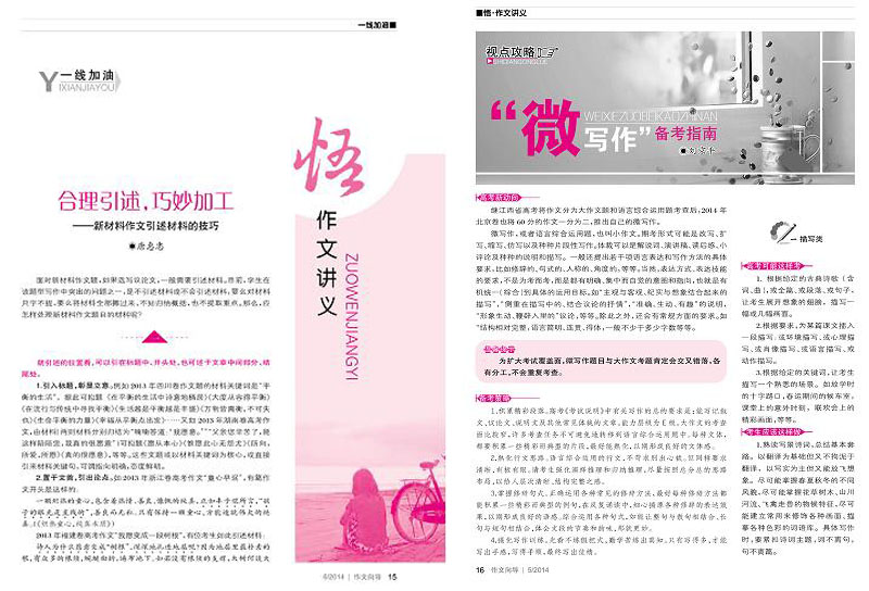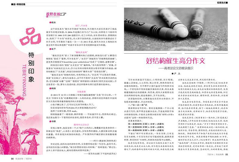 出身名門。中國教育學(xué)會學(xué)校文化建設(shè)指導(dǎo)期刊,內(nèi)蒙古出版集團(tuán)文苑報刊社傾力打造。名家主編。國家級課題顧問牟懷松先生擔(dān)綱主編。匯聚名師。依托全國作文名師考研中心,匯集一流名師,成就一流作文期刊.目標(biāo)明確。成為最佳作文技法指導(dǎo)與素材供應(yīng)平臺。