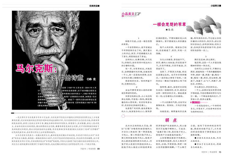 覽·性靈文字,名家經(jīng)典閱讀范本,精選報刊時鮮熱文,完美權(quán)威解讀,借你錦囊,助力高考作文高分!時文經(jīng)緯—時鮮熱文,熱氣騰騰。經(jīng)典賞讀—馬爾克斯說:“文學(xué)除了是木工活,什么也不是。”你覺得呢?