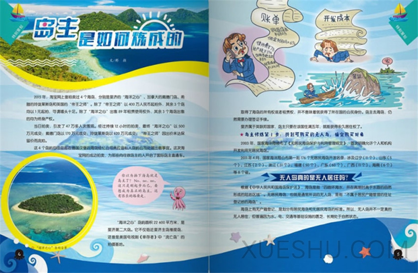 《百科探秘》分知識、文化、休閑、互動四大板塊,以圖文并茂的形式介紹多姿多彩的海洋生物、地質、軍事知識及沿海國家的海洋風光、名勝;講述與海有關的各種神話、探險和尋寶故事;還有小讀者自己創作的故事、游記、心得和發生在五位以海洋動物命名的小編身上的奇聞趣事……