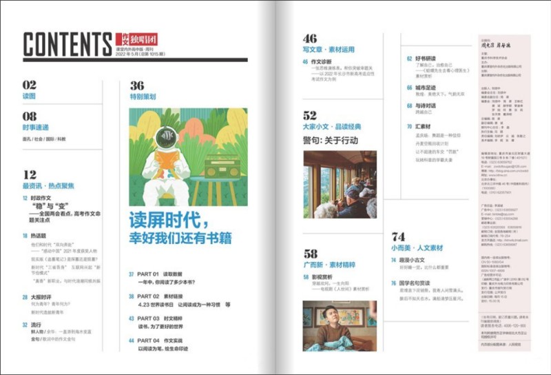 本刊全彩印刷,圖文并茂,旨在突出雜志特色,倡導(dǎo)快樂閱讀,內(nèi)容豐富多彩,形式新穎,強(qiáng)調(diào)引發(fā)讀者興趣,是一本不錯的學(xué)習(xí)輔導(dǎo)雜志。多年來雜志內(nèi)容拓寬了讀者視野,貼近讀者生活,集知識性和趣味性于一身,全彩的雜志一下子就能吸引讀者的眼球,得到了眾多讀者的歡迎。
