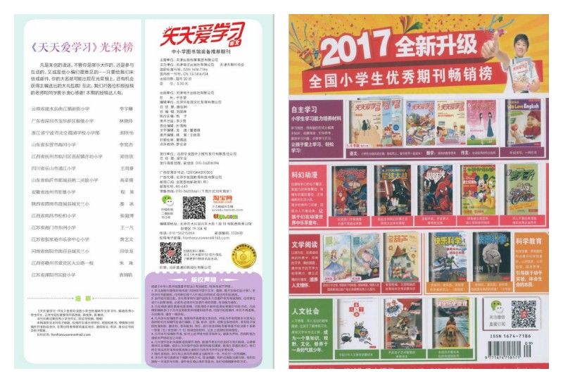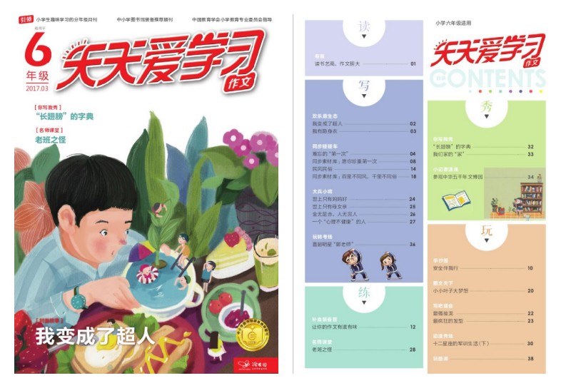 《天天愛學習》(月刊)經過多年的不懈努力,流行度高,大眾辨識度廣,創刊于2000年,開拓了視野,帶給讀者富有生活特色的內容。一款細分到年級的小學生趣味學習刊,中國教育學會小學教育專業委員會指導“小學生自主學習方略和教材研究”課題成果。