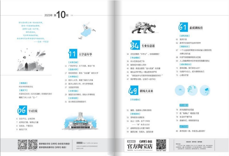 《求學(新高考)》上半月以大學專業(yè)介紹、職業(yè)真實體驗和高考學科提分為主,下半月涵蓋各個地域各個層次的大學介紹,關(guān)注高考志愿填報規(guī)則、方法和實操案例學。主要欄目:卷首語、大學嘉年華(大學之城、品讀大學、大學拾光、大學萬象)、專業(yè)有意思、職場大未來、素質(zhì)訓練營等。