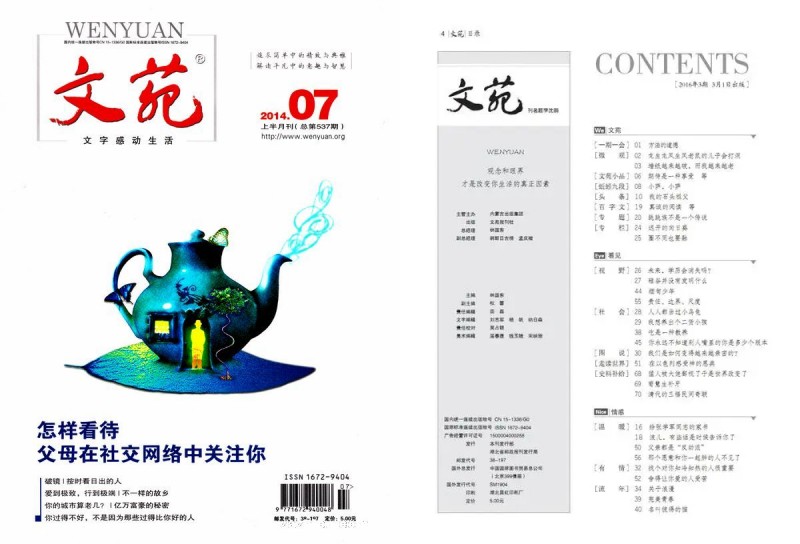 《文苑》雜志秉承“文字感動生活”的編輯理念,用精美的文字與讀者同行,唯美、精彩、清新、智慧,發人深省,感人至深,充滿生活情趣,宣揚理性哲思,追求簡單中的精致與典雅,解讀平凡中的意趣與智慧。